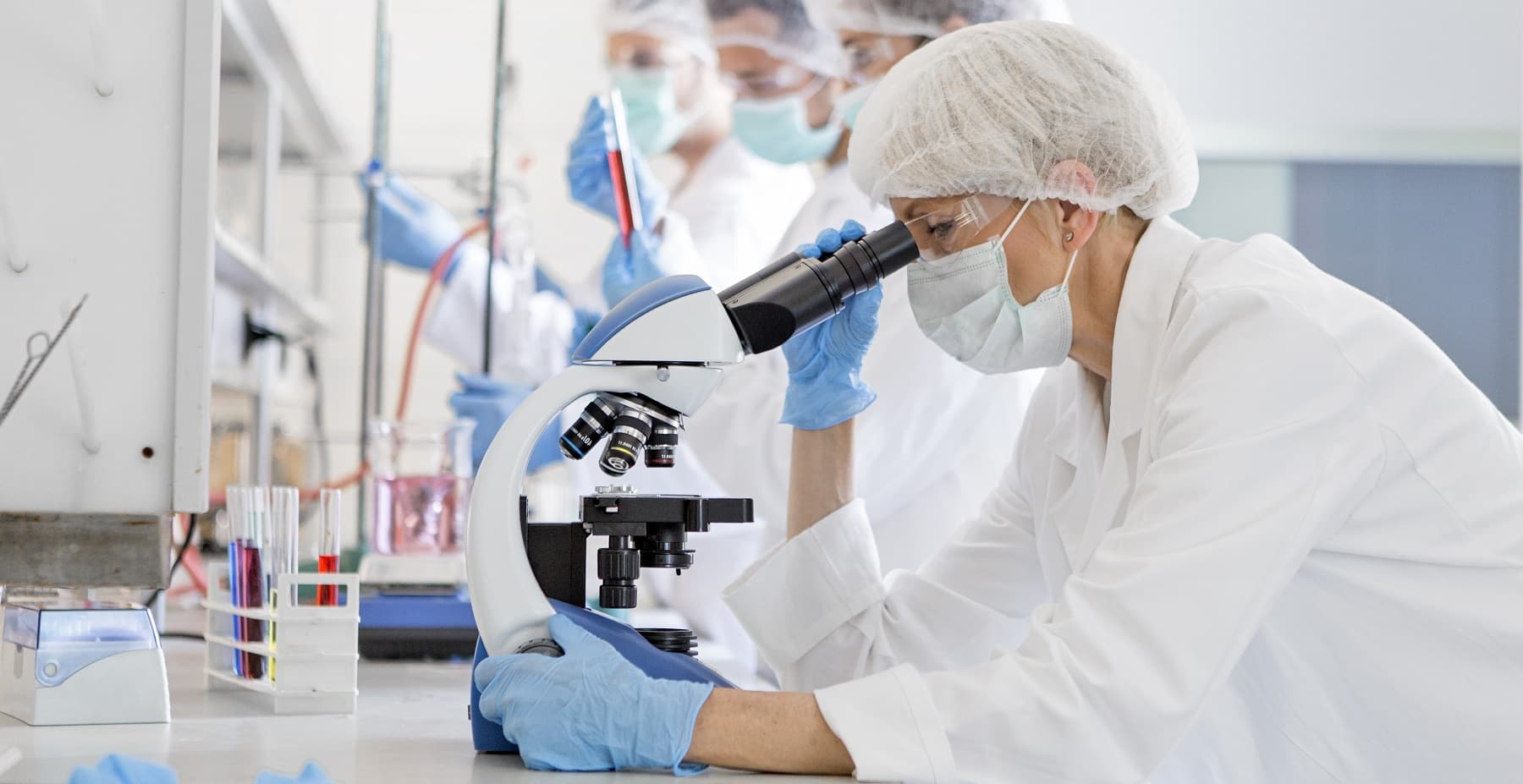 Scientists Studying A Virus ,looking Through Microscope